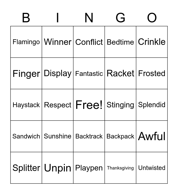 This bingo card has a free space and 24 words: Sunshine, Unpin, Fantastic, Splitter, Crinkle, Flamingo, Finger, Winner, Stinging, Backtrack, Racket, Haystack, Backpack, Awful, Display, Thanksgiving, Splendid, Conflict, Frosted, Respect, Untwisted, Sandwich, Bedtime and Playpen.