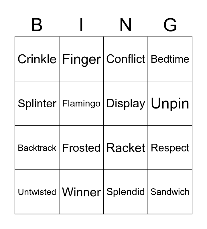 This bingo card has 24 words: Free!, Sunshine, Unpin, Fantastic, Splinter, Crinkle, Flamingo, Finger, Winner, Stinging, Backtrack, Racket, Haystack, Backpack, Display, Thanksgiving, Splendid, Conflict, Frosted, Respect, Untwisted, Sandwich, Bedtime and Playpen.