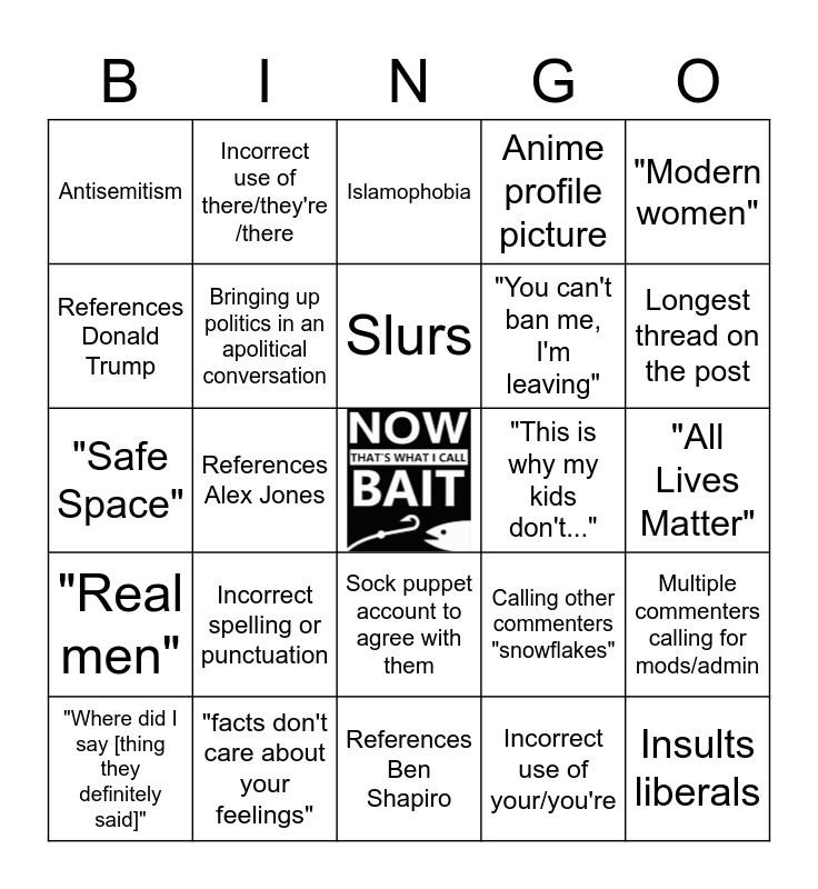 This bingo card has a free space and 24 words: Incorrect spelling or punctuation, "facts don't care about your feelings", Slurs, "Where did I say [thing they definitely said]", "Modern women", Antisemitism, References Donald Trump, Incorrect use of there/they're /there, "This is why my kids don't...", Sock puppet account to agree with them, "You can't ban me, I'm leaving", "Safe Space", Calling other commenters "snowflakes", Multiple commenters calling for mods/admin, Bringing up politics in an apolitical conversation, Incorrect use of your/you're, "All Lives Matter", Islamophobia, Longest thread on the post, References Alex Jones, Insults liberals, "Real men", Anime profile picture and References Ben Shapiro.