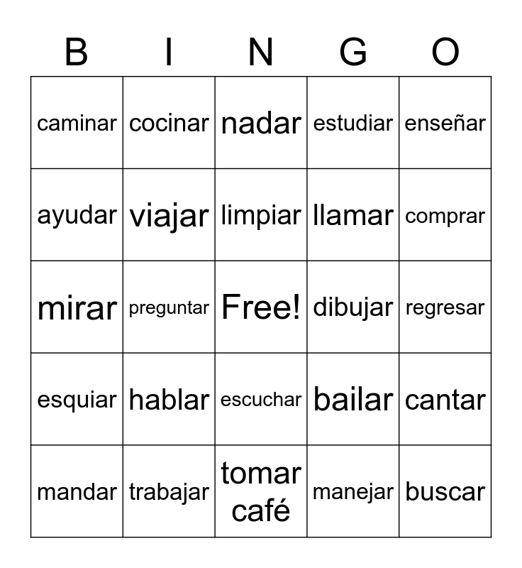 This bingo card has a free space and 24 words: hablar, trabajar, limpiar, mandar, enseñar, caminar, ayudar, cocinar, dibujar, escuchar, llamar, mirar, bailar, cantar, viajar, manejar, regresar, nadar, comprar, preguntar, buscar, esquiar, estudiar and tomar café.