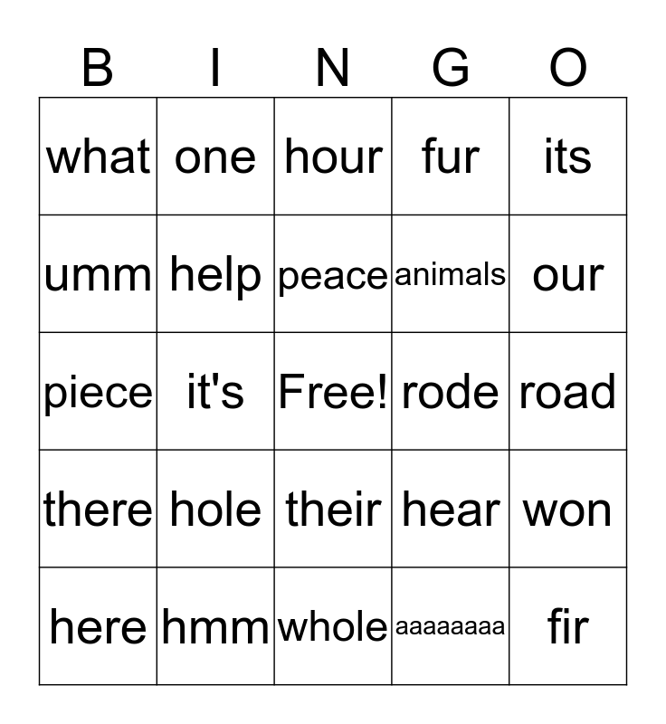 This bingo card has a free space and 24 words: hole, hmm, peace, here, its, what, umm, one, rode, their, animals, piece, hear, won, help, aaaaaaaa, road, hour, our, it's, fir, there, fur and whole.
