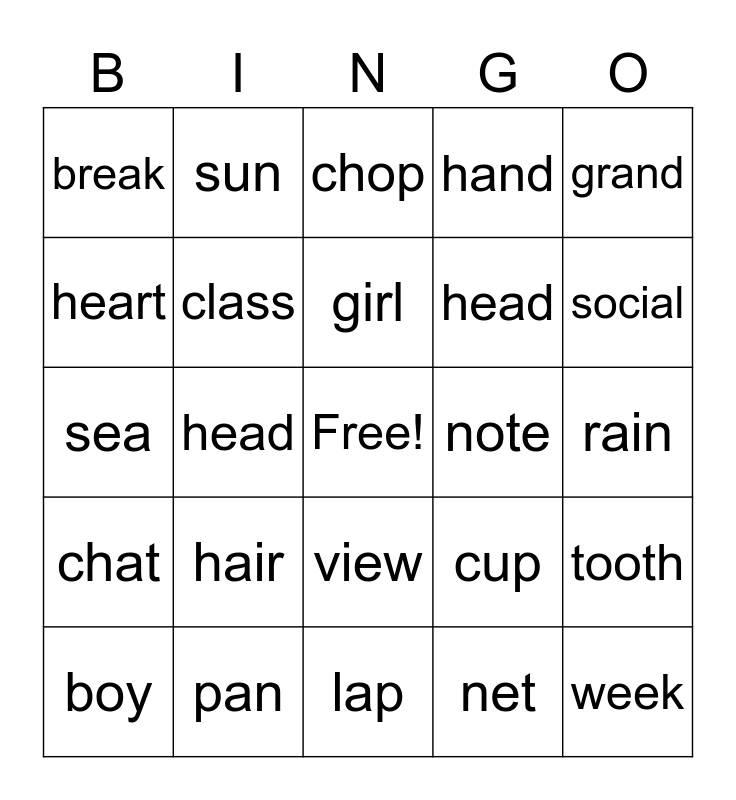 This bingo card has a free space and 29 words: boy, birth, head, book, break, chop, class, hair, note, pan, rain, week, lap, net, social, web, view, chat, grand, sea, cup, bed, head, heart, hand, sun, tooth, girl and friend.