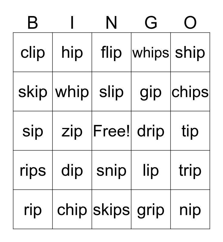 This bingo card has a free space and 24 words: dip, chip, slip, rip, ship, clip, skip, hip, drip, snip, gip, sip, lip, trip, whip, grip, tip, flip, chips, zip, nip, rips, whips and skips.