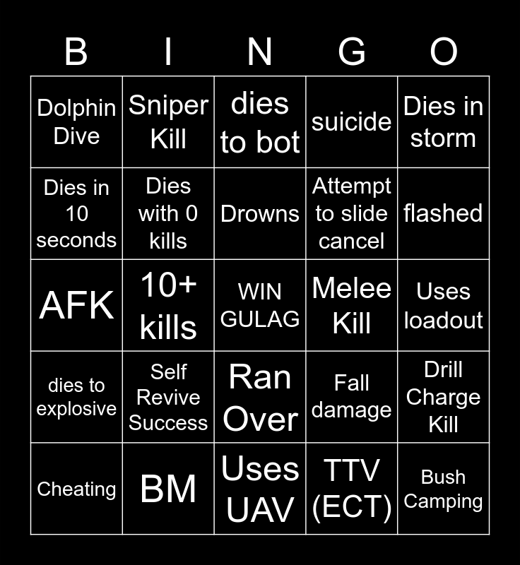 This bingo card has a free space and 24 words: Self Revive Success, BM, Drowns, Cheating, Dies in storm, Dolphin Dive, Dies in 10 seconds, Sniper Kill, Melee Kill, Ran Over, Attempt to slide cancel, AFK, Fall damage, Drill Charge Kill, Dies with 0 kills, TTV (ECT), Uses loadout, dies to bot, flashed, 10+ kills, Bush Camping, dies to explosive, suicide and Uses UAV.