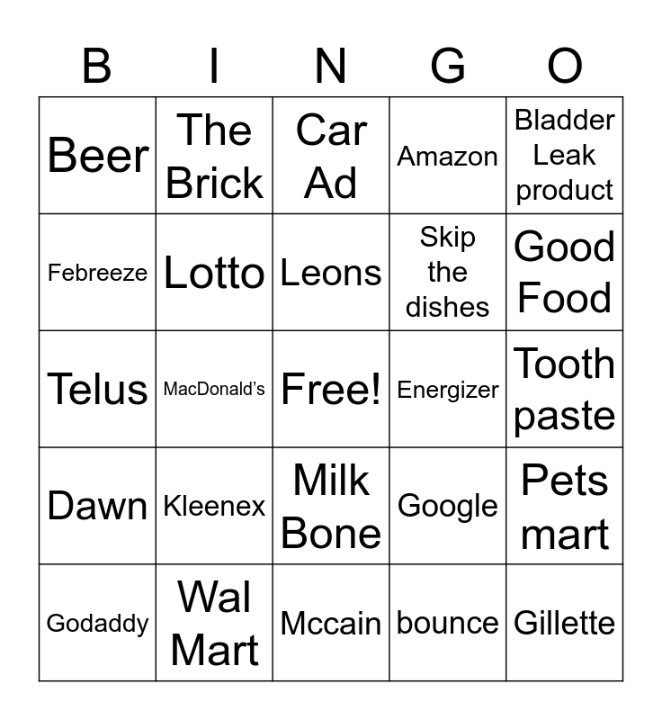 This bingo card has a free space and 29 words: Godaddy, Tide, MacDonald’s, Coke, Beer, Car Ad, Lotto, Kleenex, Energizer, Wal Mart, Tooth paste, Gillette, Mccain, bounce, Good Food, Bank, Milk Bone, Dawn, Bladder Leak product, Telus, Google, EHarmony, Skip the dishes, Febreeze, Amazon, The Brick, Pets mart, Leons and London Drugs.