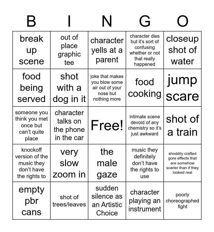 This bingo card has a free space and 30 words: shot of trees/leaves, weird filter/color grading, character talks on the phone in the car, drone shot, break up scene, character yells at a parent, shot with a dog in it, the male gaze, intimate scene devoid of any chemistry so it’s just awkward, sudden silence as an Artistic Choice, shot of a train, poorly choreographed fight, character playing an instrument, scene in another language, jump scare, actor looking off into the distance, music they definitely don’t have the rights to use, knockoff version of the music they don’t have the rights to, very slow zoom in, closeup shot of water, someone you think you met once but can’t quite place, birds chirping, out of place graphic tee, food cooking, food being served, character dies but it’s sort of confusing whether or not that really happened, shoddily crafted gore effects that are somehow scarier than if they looked real, empty pbr cans, joke that makes you blow some air out of your nose but nothing more and jorts.