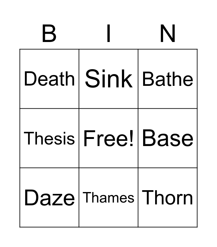 This bingo card has a free space and 66 words: Think, Seal, Northern, Therefore, Breath, Thee, Sink, Cell, Thames, Bath, Whither, Girth, That, Thorn, Them, Base, Throat, Death, Sat, Truth, Health, Thriller, Thesis, Neither, The, Truce, Path, Ruthless, Earth, filth, This, Three, Pace, Tenth, Those, Method, Sis’, Thirteen, Oath, Mother, Daze, Author, Though, Sir, Thug, Father, Threw, Silence, Through, See, Other, Brother, Maths, Secret, Thought, Thin, Theirs, Feather, Bathe, Social, Seek, Thick, Worthy, Breathe, Gaze and Pass.
