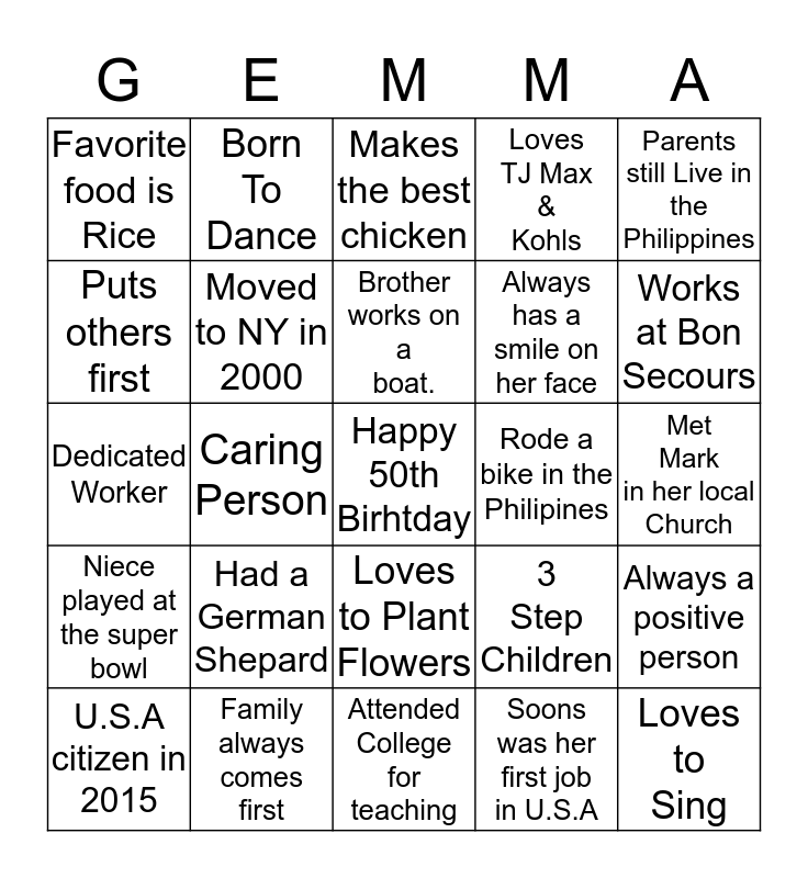 This bingo card has a free space and 24 words: Had a German Shepard, Family always comes first, Brother works on a boat., U.S.A citizen in 2015, Parents still Live in the Philippines, Favorite food is Rice, Puts others first, Born To Dance, Rode a bike in the Philipines, Loves to Plant Flowers, Always has a smile on her face, Dedicated Worker, 3 Step Children, Always a positive person, Moved to NY in 2000, Soons was her first job in U.S.A, Met Mark in her local Church, Makes the best chicken, Works at Bon Secours, Caring Person, Loves to Sing, Niece played at the super bowl, Loves TJ Max & Kohls and Attended College for teaching.