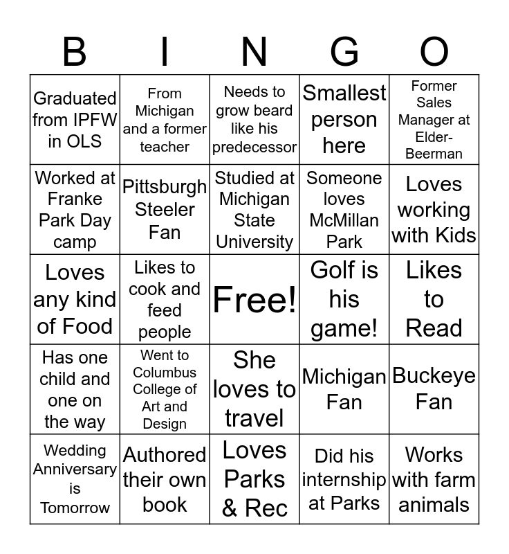 This bingo card has a free space and 24 words: Went to Columbus College of Art and Design, Authored their own book, Studied at Michigan State University, Wedding Anniversary is Tomorrow, Former Sales Manager at Elder- Beerman, Graduated from IPFW in OLS, Worked at Franke Park Day camp, From Michigan and a former teacher, Golf is his game!, She loves to travel, Someone loves McMillan Park, Loves any kind of Food, Michigan Fan, Buckeye Fan, Pittsburgh Steeler Fan, Did his internship at Parks, Likes to Read, Needs to grow beard like his predecessor, Loves working with Kids, Likes to cook and feed people, Works with farm animals, Has one child and one on the way, Smallest person here and Loves Parks & Rec.