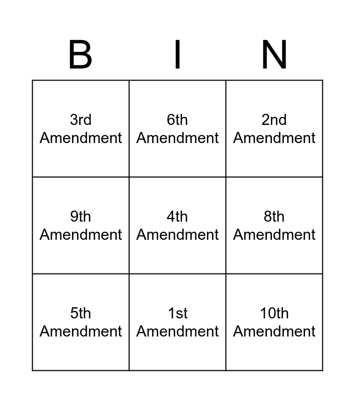 This bingo card has 10 words: 1st Amendment, 2nd Amendment, 3rd Amendment, 4th Amendment, 9th Amendment, 5th Amendment, 6th Amendment, 7th Amendment, 8th Amendment and 10th Amendment.