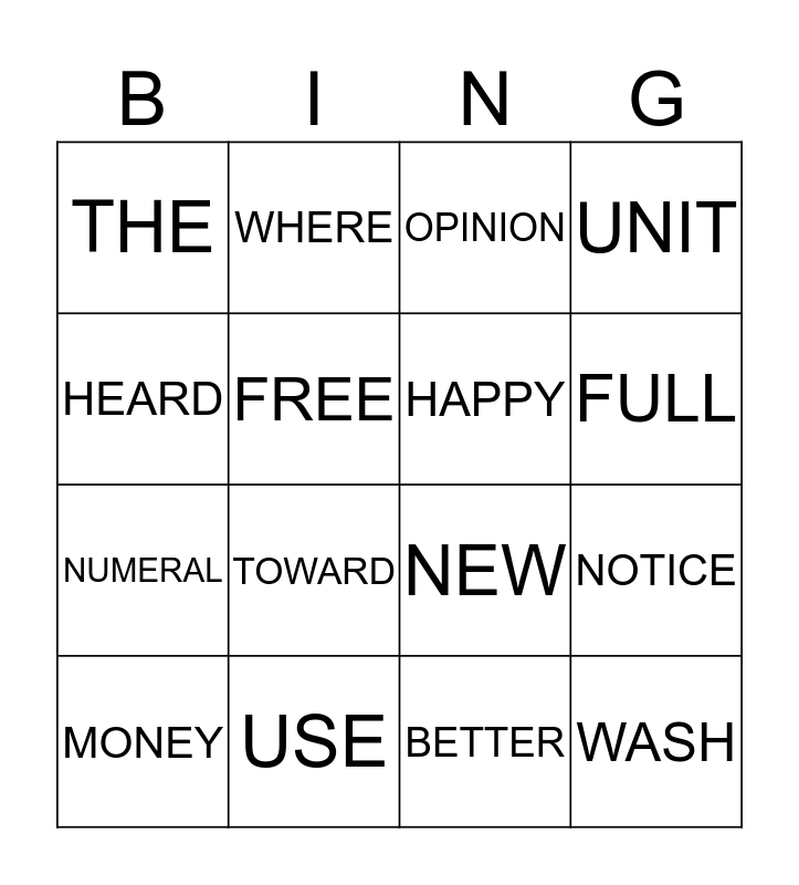 This bingo card has 16 words: USE, NOTICE, OPINION, THE, NUMERAL, WHERE, NEW, BETTER, HEARD, FREE, MONEY, UNIT, TOWARD, FULL, HAPPY and WASH.