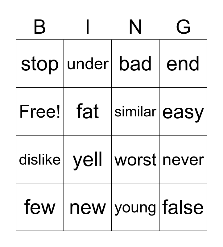 This bingo card has 16 words: new, never, bad, stop, dislike, under, worst, young, Free!, fat, few, end, yell, easy, similar and false.
