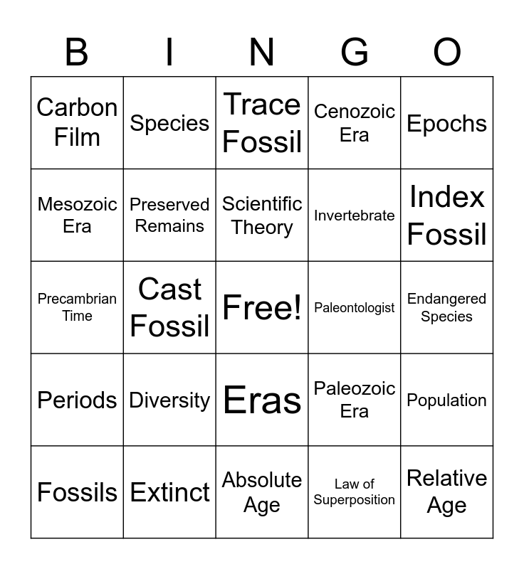 This bingo card has a free space and 29 words: Fossils, Mold Fossil, Cast Fossil, Petrified Fossil, Carbon Film, Trace Fossil, Preserved Remains, Diversity, Paleontologist, Extinct, Endangered Species, Relative Age, Absolute Age, Law of Superposition, Index Fossil, Geologic Time Scale, Eras, Periods, Epochs, Precambrian Time, Paleozoic Era, Vertebrate, Invertebrate, Mesozoic Era, Cenozoic Era, Species, Population, Scientific Theory and Offspring.
