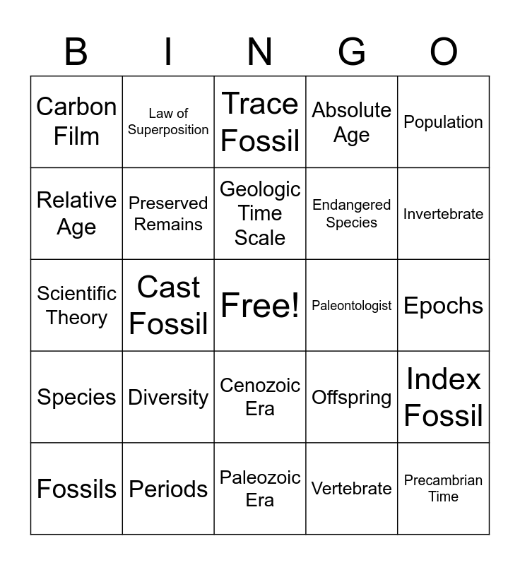 This bingo card has a free space and 29 words: Fossils, Mold Fossil, Cast Fossil, Petrified Fossil, Carbon Film, Trace Fossil, Preserved Remains, Diversity, Paleontologist, Periods, Epochs, Precambrian Time, Paleozoic Era, Vertebrate, Invertebrate, Mesozoic Era, Cenozoic Era, Species, Population, Scientific Theory, Offspring, Extinct, Endangered Species, Relative Age, Absolute Age, Law of Superposition, Index Fossil, Geologic Time Scale and Eras.