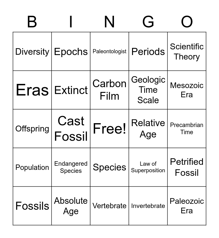 This bingo card has a free space and 29 words: Fossils, Mold Fossil, Cast Fossil, Preserved Remains, Diversity, Paleontologist, Extinct, Endangered Species, Relative Age, Absolute Age, Precambrian Time, Paleozoic Era, Vertebrate, Invertebrate, Mesozoic Era, Cenozoic Era, Species, Population, Scientific Theory, Offspring, Law of Superposition, Index Fossil, Geologic Time Scale, Eras, Periods, Epochs, Petrified Fossil, Carbon Film and Trace Fossil.