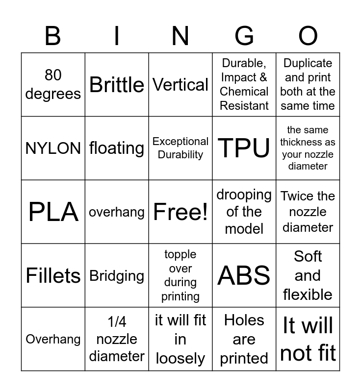 This bingo card has a free space and 29 words: Overhang, 30, overhang, 30 degrees, 80 degrees, Vertical, floating, Bridging, drooping of the model, 1/4 nozzle diameter, Twice the nozzle diameter, It will not fit, it will fit in loosely, Holes are printed, the same thickness as your nozzle diameter, Sufficient surface area touching the bed, topple over during printing, Fillets, Duplicate and print both at the same time, PLA, ABS, PETG, TPU, NYLON, Durable, Impact & Chemical Resistant, Brittle, Soft and flexible, Exceptional Durability and Tinkercad.