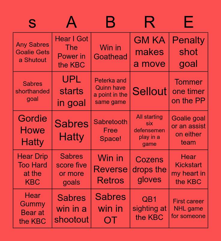 This bingo card has a free space and 29 words: Hear Gummy Bear at the KBC, D-Man shootout goal, Sabres Hatty, Dahlin drops the gloves, Any Sabres Goalie Gets a Shutout, Win in Goathead, UPL starts in goal, Sabres score five or more goals, All starting six defensemen play in a game, Sabres win in a shootout, Goalie goal or an assist on either team, First career NHL game for someone, Sabres win in OT, QB1 sighting at the KBC, Tommer one timer on the PP, Successful coach's challenge, Win in Reverse Retros, Hear Drip Too Hard at the KBC, Penalty shot goal, Gordie Howe Hatty, Cozens drops the gloves, An opposing team fan in the STM suite, Sellout, Sabres shorthanded goal, GM KA makes a move, Hear I Got The Power in the KBC, Hear Kickstart my heart in the KBC, Peterka and Quinn have a point in the same game and Tuch and Tommer score in the same game.