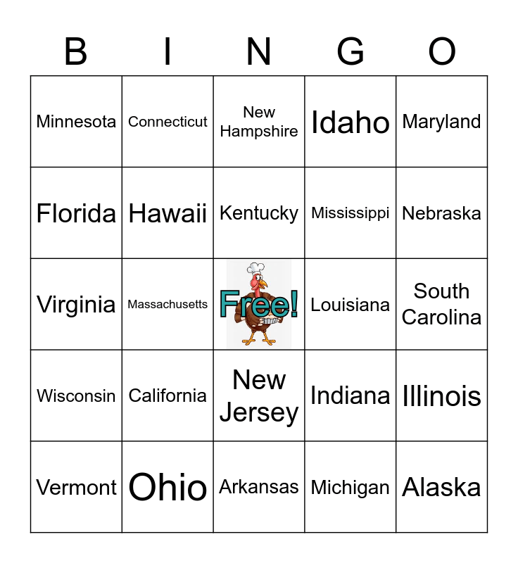 This bingo card has a free space and 50 words: Alabama, Alaska, Arizona, Arkansas, California, Colorado, Connecticut, Delaware, Florida, Georgia, Hawaii, Idaho, Illinois, Indiana, Iowa, Kansas, Kentucky, Louisiana, Maine, Maryland, Massachusetts, Michigan, Minnesota, Mississippi, Missouri, Montana, Nebraska, Nevada, New Hampshire, New Jersey, New Mexico, New York, North Carolina, North Dakota, Ohio, Oklahoma, Oregon, Pennsylvania, Rhode Island, South Carolina, South Dakota, Tennessee, Texas, Utah, Vermont, Virginia, Washington, West Virginia, Wisconsin and Wyoming.