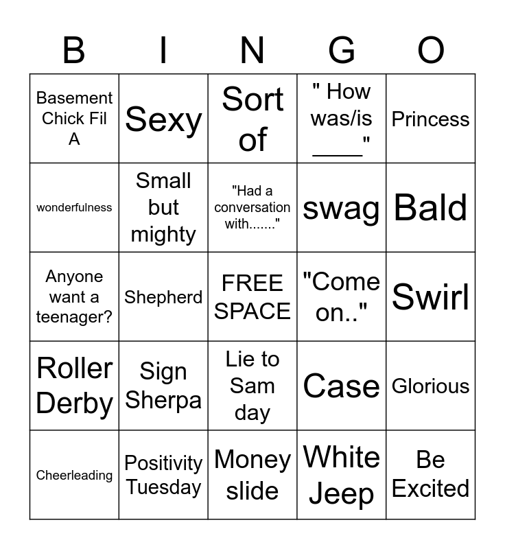 This bingo card has a free space and 24 words: Sign Sherpa, Positivity Tuesday, "Had a conversation with.......", Cheerleading, Princess, Basement Chick Fil A, wonderfulness, Sexy, "Come on..", Lie to Sam day, swag, Anyone want a teenager?, Case, Glorious, Small but mighty, White Jeep, Swirl, Sort of, Bald, Shepherd, Be Excited, Roller Derby, " How was/is ____" and Money slide.