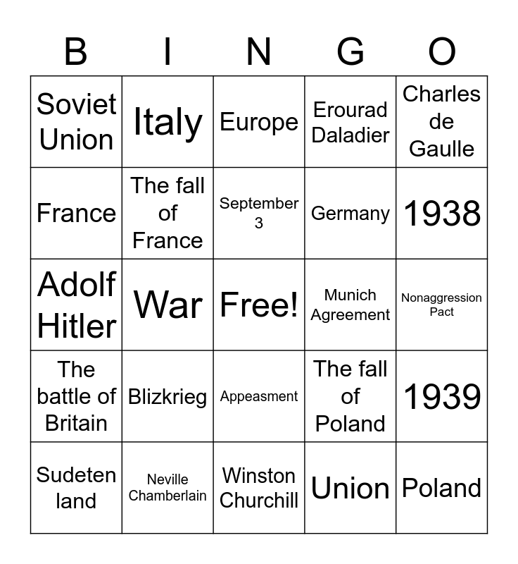 This bingo card has a free space and 29 words: Sudeten land, Neutrality, War, Austria, Soviet Union, Europe, The fall of France, Blizkrieg, Munich Agreement, Neville Chamberlain, Nonaggression Pact, Poland, Winston Churchill, Union, 1938, Czechosl ovoakia, Appeasment, The battle of Britain, Charles de Gaulle, Adolf Hitler, The fall of Poland, Great Britain, Germany, France, Erourad Daladier, Italy, 1939, September 3 and Maginot Line.