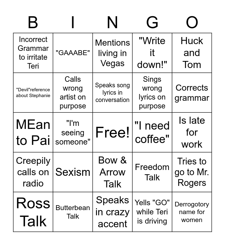 This bingo card has a free space and 24 words: Sexism, Butterbean Talk, Speaks song lyrics in conversation, Ross Talk, Huck and Tom, Incorrect Grammar to irritate Teri, "Devil"reference about Stephanie, "GAAABE", "I need coffee", Bow & Arrow Talk, Sings wrong lyrics on purpose, MEan to Pai, Freedom Talk, Tries to go to Mr. Rogers, Calls wrong artist on purpose, Yells "GO" while Teri is driving, Is late for work, Mentions living in Vegas, Corrects grammar, "I'm seeing someone", Derrogotory name for women, Creepily calls on radio, "Write it down!" and Speaks in crazy accent.