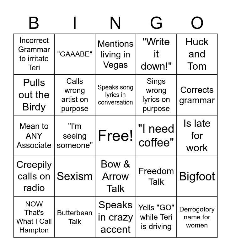 This bingo card has a free space and 24 words: Sexism, Butterbean Talk, Speaks song lyrics in conversation, NOW That's What I Call Hampton, Huck and Tom, Incorrect Grammar to irritate Teri, Pulls out the Birdy, "GAAABE", "I need coffee", Bow & Arrow Talk, Sings wrong lyrics on purpose, Mean to ANY Associate, Freedom Talk, Bigfoot, Calls wrong artist on purpose, Yells "GO" while Teri is driving, Is late for work, Mentions living in Vegas, Corrects grammar, "I'm seeing someone", Derrogotory name for women, Creepily calls on radio, "Write it down!" and Speaks in crazy accent.