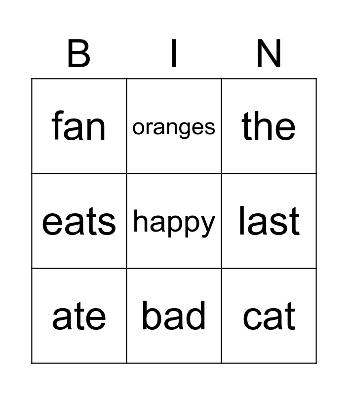 This bingo card has a free space and 23 words: Banana, at, bad, breakfast, cat, fan, last, oranges, sandwiches, that, a, and, for, he, is, of, the, was, ate, day, eats, ever and ice cream.