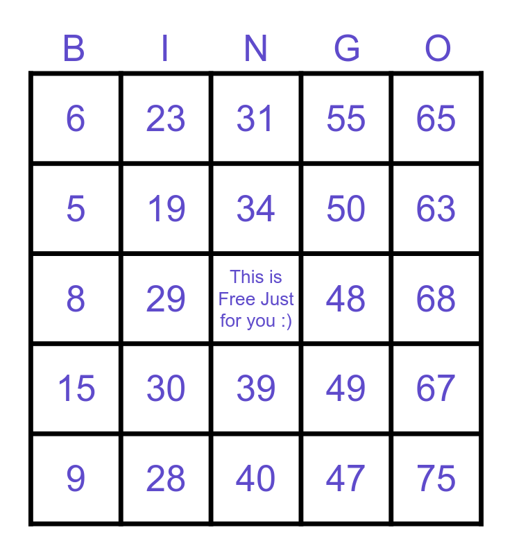This bingo card has a free space and 75 words: 1, 16, 31, 46, 61, 2, 17, 32, 47, 62, 3, 18, 48, 63, 4, 19, 33, 49, 64, 5, 20, 34, 50, 65, 6, 21, 35, 51, 66, 7, 22, 36, 52, 67, 8, 23, 37, 53, 68, 9, 24, 38, 54, 69, 10, 25, 39, 55, 70, 11, 26, 40, 56, 71, 12, 27, 41, 57, 72, 13, 28, 42, 58, 73, 14, 29, 43, 59, 74, 15, 30, 44, 60, 75 and 45.