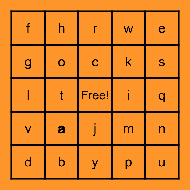 This bingo card has a free space and 24 words: a, b, c, d, e, f, g, h, i, j, k, l, m, n, o, p, q, r, s, t, u, v, w and y.