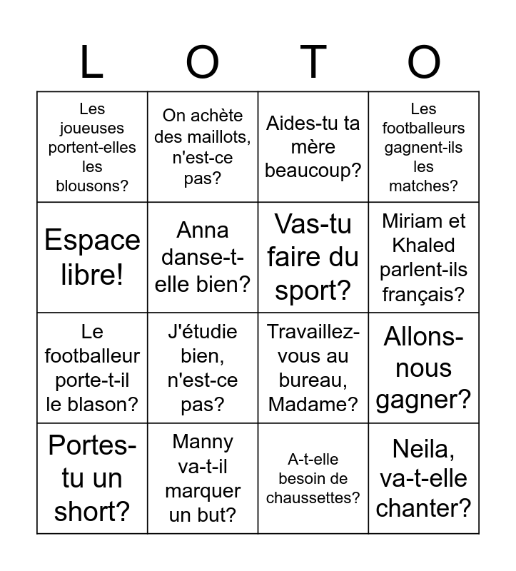 This bingo card has 16 words: Manny va-t-il marquer un but?, Allons-nous gagner?, Aides-tu ta mère beaucoup?, Les joueuses portent-elles les blousons?, Le footballeur porte-t-il le blason?, On achète des maillots, n'est-ce pas?, Travaillez-vous au bureau, Madame?, A-t-elle besoin de chaussettes?, Espace libre!, Anna danse-t-elle bien?, Portes-tu un short?, Les footballeurs gagnent-ils les matches?, J'étudie bien, n'est-ce pas?, Miriam et Khaled parlent-ils français?, Vas-tu faire du sport? and Neila, va-t-elle chanter?.