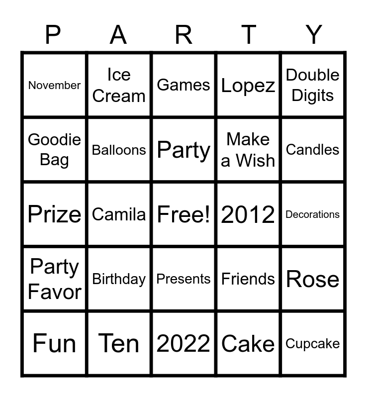 This bingo card has a free space and 24 words: Birthday, Ten, Party, Fun, Double Digits, November, Goodie Bag, Ice Cream, 2012, Presents, Make a Wish, Prize, Friends, Rose, Balloons, Cake, Decorations, Games, Candles, Camila, Cupcake, Party Favor, Lopez and 2022.