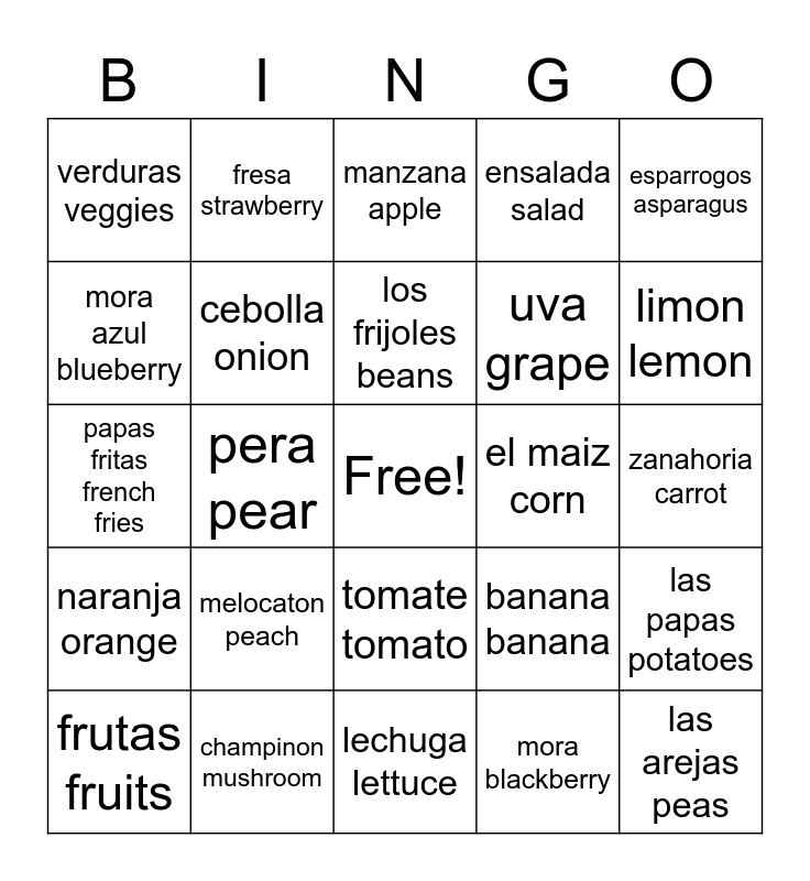 This bingo card has a free space and 24 words: melocaton peach, champinon mushroom, los frijoles beans, frutas fruits, esparrogos asparagus, verduras veggies, mora azul blueberry, fresa strawberry, el maiz corn, tomate tomato, uva grape, papas fritas french fries, banana banana, las papas potatoes, cebolla onion, mora blackberry, zanahoria carrot, manzana apple, limon lemon, pera pear, las arejas peas, naranja orange, ensalada salad and lechuga lettuce.