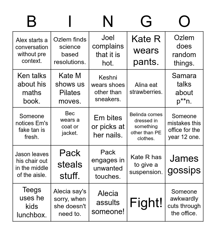 This bingo card has 25 words: Jason leaves his chair out in the middle of the aisle., Alecia say's sorry, when she doesn't need to., Em bites or picks at her nails., Fight!, Ozlem does random things., Alex starts a conversation without pre context., Ozlem finds science based resolutions., Joel complains that it is hot., Belinda comes dressed in something other than PE clothes., James gossips, Ken talks about his maths book., Kate M shows us Pilates moves., Alecia assults someone!, Kate R has to give a suspension., Samara talks about p**n., Teegs uses he kids lunchbox., Bec wears a coat or jacket., Keshni wears shoes other than sneakers., Alina eat strawberries., Someone mistakes this office for the year 12 one., Someone notices Em's fake tan is fresh., Pack steals stuff., Pack engages in unwanted touches., Kate R wears pants. and Someone awkwardly cuts through the office..