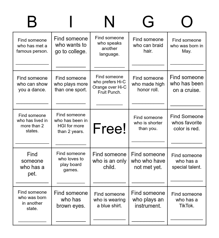This bingo card has a free space and 34 words: Find Someone Who was born between 2010 and 2015. ____________, Find someone who plays an instrument. ___________, Find someone who is left handed. ___________, Find someone who likes to sing. ____________, Find someone who has a pet. ___________, Find someone who plays more than one sport. ___________, Find someone who was born in May. _____________, Find someone who was born in another state. ___________, Find someone who wants to go to college. __________, Find someone who enjoys cooking. ___________, Find someone who prefers Hi-C Orange over Hi-C Fruit Punch. ___________, Find someone who speaks another language. ____________, Find someone who can paint. __________, Find someone who was born in the same month as you. ___________, Find someone who is shorter than you. _____________, Find someone who has been on a cruise. ___________, Find someone who has brown eyes. __________, Find someone who has lived in more than 2 states. ______________, Find someone who loves to play board games. ___________, Find someone who who have not met yet. ___________, Find someone who is an only child. ___________, Find someone who does not like milk. ___________, Find someone who has met a famous person. _____________, Find Someone whos favorite color is red. ___________, Find someone who is wearing a blue shirt. ____________, Find someone who has a TikTok. ____________, Find someone who can braid hair. ____________, Find someone who loves to play volleyball. ____________, Find someone who made high honor roll. ____________, Find someone who can show you a dance. ____________, Find someone who prefers McDonald's over Chic-Fil-A. ____________, Find someone who has been in HGI for more than 2 years. ____________, Find someone who has a special talent. ____________ and Find someone who is the oldest child. ____________.
