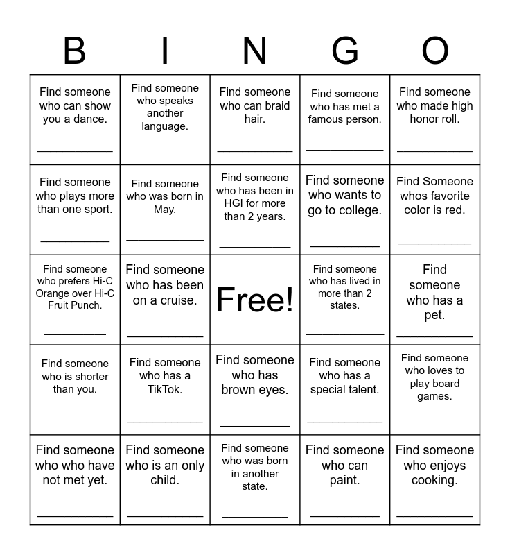 This bingo card has a free space and 34 words: Find Someone Who was born between 2010 and 2015. ____________, Find someone who plays an instrument. ___________, Find someone who is left handed. ___________, Find someone who likes to sing. ____________, Find someone who has a pet. ___________, Find someone who plays more than one sport. ___________, Find someone who was born in May. _____________, Find someone who was born in another state. ___________, Find someone who wants to go to college. __________, Find someone who enjoys cooking. ___________, Find someone who prefers Hi-C Orange over Hi-C Fruit Punch. ___________, Find someone who speaks another language. ____________, Find someone who can paint. __________, Find someone who was born in the same month as you. ___________, Find someone who is shorter than you. _____________, Find someone who has been on a cruise. ___________, Find someone who has brown eyes. __________, Find someone who has lived in more than 2 states. ______________, Find someone who loves to play board games. ___________, Find someone who who have not met yet. ___________, Find someone who is an only child. ___________, Find someone who does not like milk. ___________, Find someone who has met a famous person. _____________, Find Someone whos favorite color is red. ___________, Find someone who is wearing a blue shirt. ____________, Find someone who has a TikTok. ____________, Find someone who can braid hair. ____________, Find someone who loves to play volleyball. ____________, Find someone who made high honor roll. ____________, Find someone who can show you a dance. ____________, Find someone who prefers McDonald's over Chic-Fil-A. ____________, Find someone who has been in HGI for more than 2 years. ____________, Find someone who has a special talent. ____________ and Find someone who is the oldest child. ____________.