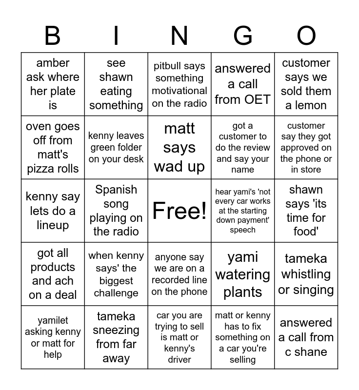 This bingo card has a free space and 24 words: when kenny says' the biggest challenge, tameka sneezing from far away, matt says wad up, yamilet asking kenny or matt for help, customer says we sold them a lemon, amber ask where her plate is, oven goes off from matt's pizza rolls, see shawn eating something, hear yami's 'not every car works at the starting down payment' speech, anyone say we are on a recorded line on the phone, got a customer to do the review and say your name, kenny say lets do a lineup, yami watering plants, tameka whistling or singing, kenny leaves green folder on your desk, matt or kenny has to fix something on a car you're selling, shawn says 'its time for food', pitbull says something motivational on the radio, customer say they got approved on the phone or in store, Spanish song playing on the radio, answered a call from c shane, got all products and ach on a deal, answered a call from OET and car you are trying to sell is matt or kenny's driver.