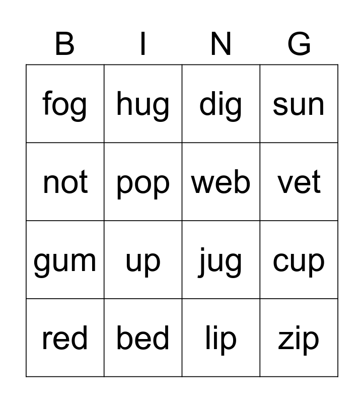 This bingo card has 16 words: bed, cup, dig, fog, gum, hug, jug, lip, not, pop, red, sun, up, vet, web and zip.