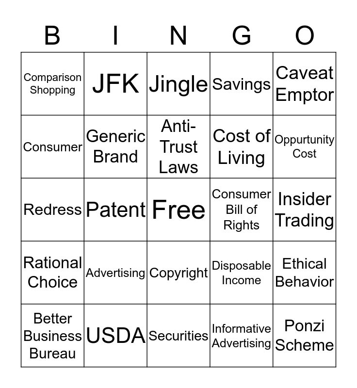 This bingo card has a free space and 24 words: Advertising, USDA, Anti-Trust Laws, Better Business Bureau, Caveat Emptor, Comparison Shopping, Consumer, JFK, Consumer Bill of Rights, Copyright, Cost of Living, Redress, Disposable Income, Ethical Behavior, Generic Brand, Informative Advertising, Insider Trading, Jingle, Oppurtunity Cost, Patent, Ponzi Scheme, Rational Choice, Savings and Securities.
