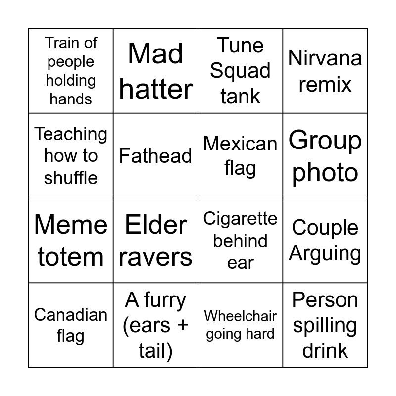 This bingo card has 31 words: Free!, Pasties + Thong, Couple Arguing, Rick & Morty, Train of people holding hands, Tune Squad tank, Mexican flag, Matching gay couple, A furry (ears + tail), Unicorn onesie, Wheelchair going hard, Canadian flag, Glover rolling, Undercover, Elder ravers, Sunglasses after dark, D.A.R.E. item, Person needs a lighter, Person spilling drink, Person actively doing drugs, Teaching how to shuffle, Rezz goggles, Anjuna tattoo, Mad hatter, Meme totem, Fathead, Nirvana remix, Cigarette behind ear, First time rolling/raving, Group photo and Free hugs sign.