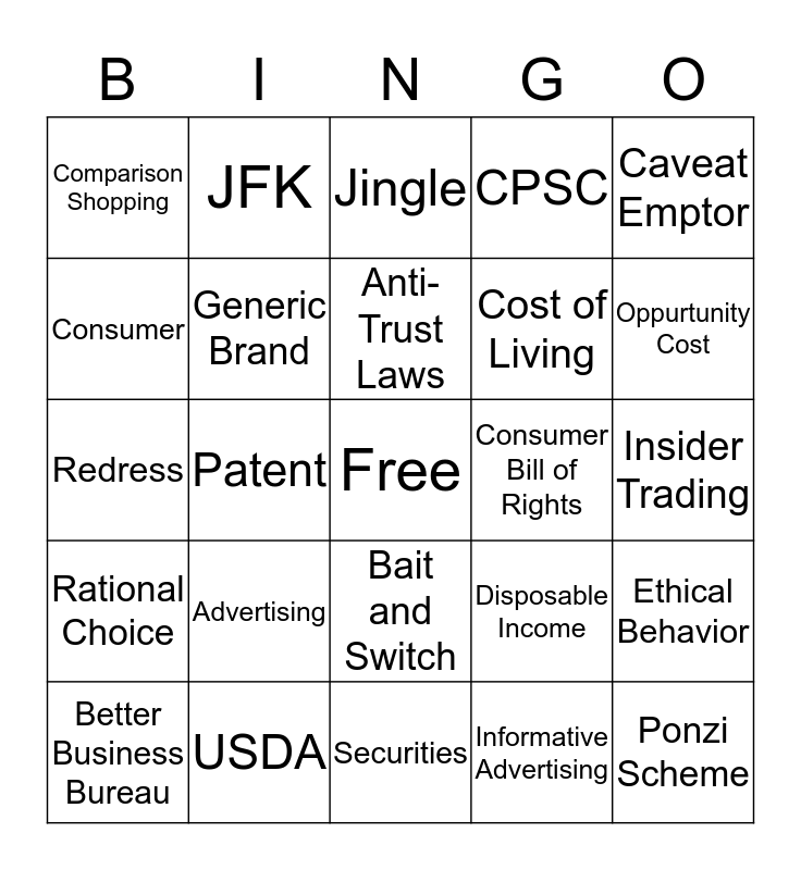 This bingo card has a free space and 24 words: Advertising, USDA, Anti-Trust Laws, Better Business Bureau, Caveat Emptor, Comparison Shopping, Consumer, JFK, Consumer Bill of Rights, Bait and Switch, Cost of Living, Redress, Disposable Income, Ethical Behavior, Generic Brand, Informative Advertising, Insider Trading, Jingle, Oppurtunity Cost, Patent, Ponzi Scheme, Rational Choice, CPSC and Securities.