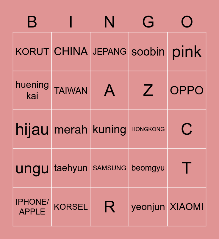 This bingo card has a free space and 24 words: taehyun, KORSEL, A, IPHONE/ APPLE, pink, KORUT, huening kai, CHINA, HONGKONG, SAMSUNG, Z, hijau, beomgyu, T, TAIWAN, yeonjun, C, JEPANG, OPPO, merah, XIAOMI, ungu, soobin and R.