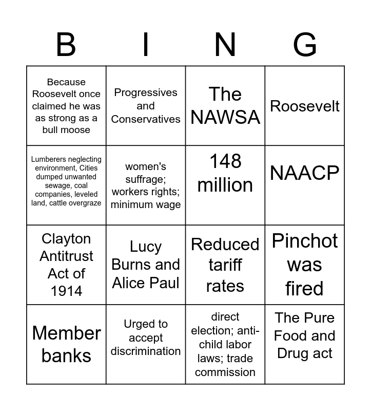 This bingo card has 16 words: Urged to accept discrimination, Pinchot was fired, The NAWSA, Because Roosevelt once claimed he was as strong as a bull moose, Clayton Antitrust Act of 1914, Progressives and Conservatives, Reduced tariff rates, direct election; anti-child labor laws; trade commission, Lumberers neglecting environment, Cities dumped unwanted sewage, coal companies, leveled land, cattle overgraze, women's suffrage; workers rights; minimum wage, Member banks, Roosevelt, Lucy Burns and Alice Paul, NAACP, 148 million and The Pure Food and Drug act.