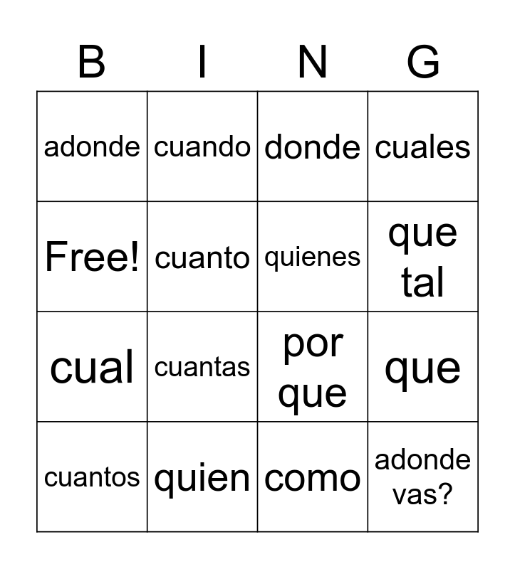 This bingo card has 16 words: quien, que, donde, adonde, cual, cuando, por que, como, Free!, cuanto, cuantos, cuales, cuantas, que tal, quienes and adonde vas?.