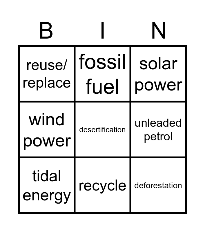 This bingo card has 9 words: tidal energy, solar power, fossil fuel, wind power, reuse/ replace, unleaded petrol, desertification, deforestation and recycle.