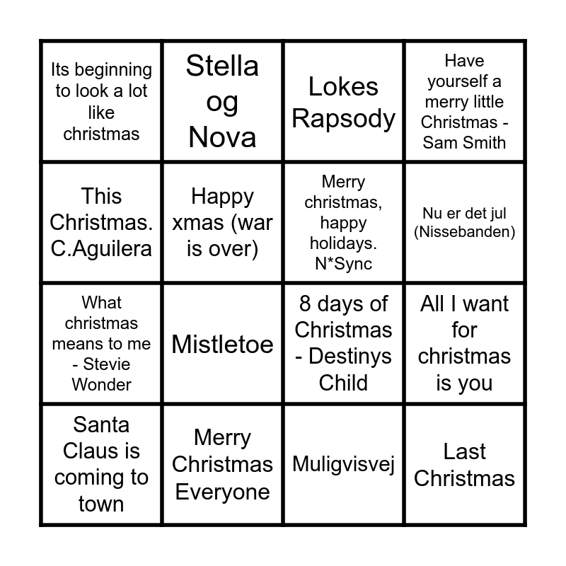 This bingo card has 32 words: Jesus og Josefine, Let love be love, All I want for christmas is you, My only wish (this year) - B.Spears, Last Christmas, Merry christmas, happy holidays. N*Sync, This Christmas. C.Aguilera, Drømte mig en lille drøm, Stella og Nova, Pagten, Nu er det jul (Nissebanden), Lokes Rapsody, I morgen og i dag, Koldt udenfor - Page Four, Merry Christmas Everyone, En rigtig drengejul, White Christmas, 8 days of Christmas - Destinys Child, Jingle Bell Rock, Christmas in Hollis - Run D.M.C, Cool Jul, Gi' Mig Slik, Muligvisvej, Flødebolleræs, Santa Claus is coming to town, Have yourself a merry little Christmas - Sam Smith, What christmas means to me - Stevie Wonder, Happy xmas (war is over), Its beginning to look a lot like christmas, Guld Jul, Jul i Angora and Mistletoe.