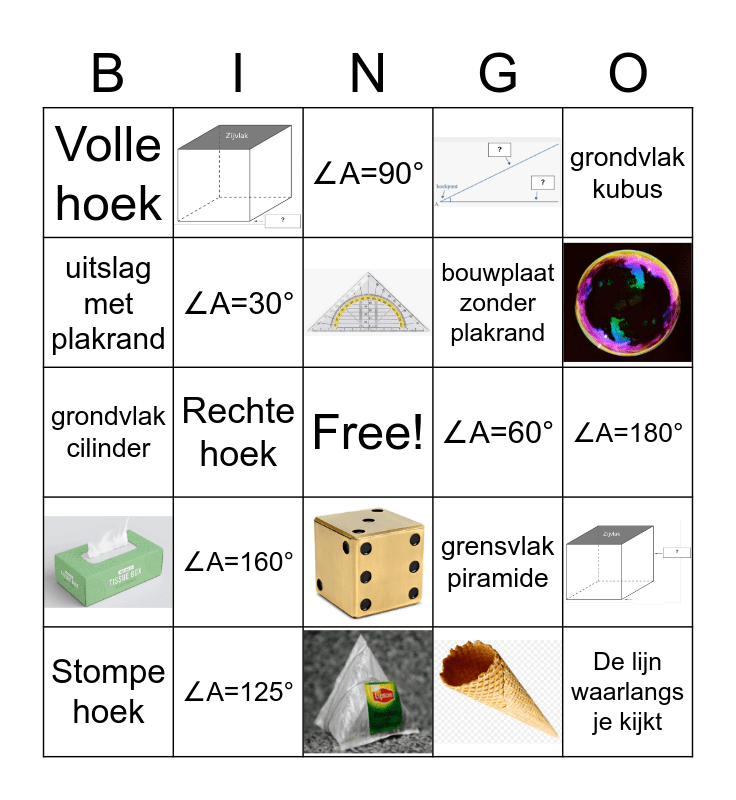 This bingo card has 11 images, a free space and 18 words: Stompe hoek, Scherpe hoek, Rechte hoek, Gestrekte hoek, Volle hoek, ∠A=90°, ∠A=30°, ∠A=160°, ∠A=60°, ∠A=125°, ∠A=180°, De lijn waarlangs je kijkt, grondvlak kubus, grondvlak cilinder, grensvlak piramide, grensvlak balk, bouwplaat zonder plakrand and uitslag met plakrand.