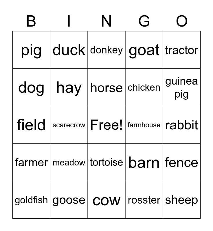 This bingo card has a free space and 27 words: barn, cat, chicken, cow, dog, donkey, duck, farmer, farmhouse, fence, field, goat, goldfish, goose, guinea pig, hamster, hay, horse, meadow, pig, rabbit, rosster, scarecrow, sheep, tortoise, tractor and turkey.