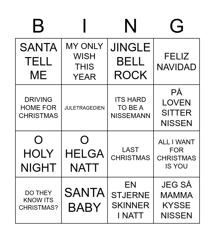 This bingo card has 16 words: SANTA BABY, ALL I WANT FOR CHRISTMAS IS YOU, JINGLE BELL ROCK, SANTA TELL ME, O HOLY NIGHT, MY ONLY WISH THIS YEAR, LAST CHRISTMAS, EN STJERNE SKINNER I NATT, DRIVING HOME FOR CHRISTMAS, JULETRAGEDIEN, DO THEY KNOW ITS CHRISTMAS?, FELIZ NAVIDAD, O HELGA NATT, PÅ LOVEN SITTER NISSEN, ITS HARD TO BE A NISSEMANN and JEG SÅ MAMMA KYSSE NISSEN.