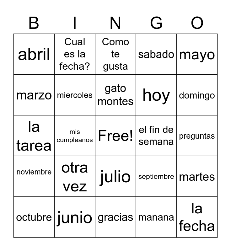 This bingo card has a free space and 35 words: enero, me llamo, agosto, miercoles, julio, sabado, marzo, diciembre, gato montes, jueves, la tarea, mayo, por favor, viernes, abril, el fin de semana, manana, mis cumpleanos, noviembre, la fecha, septiembre, octubre, martes, junio, Como te gusta, domingo, de nada, Como te llamas, hoy, preguntas, febrero, gracias, otra vez, Cual es la fecha? and ayer.