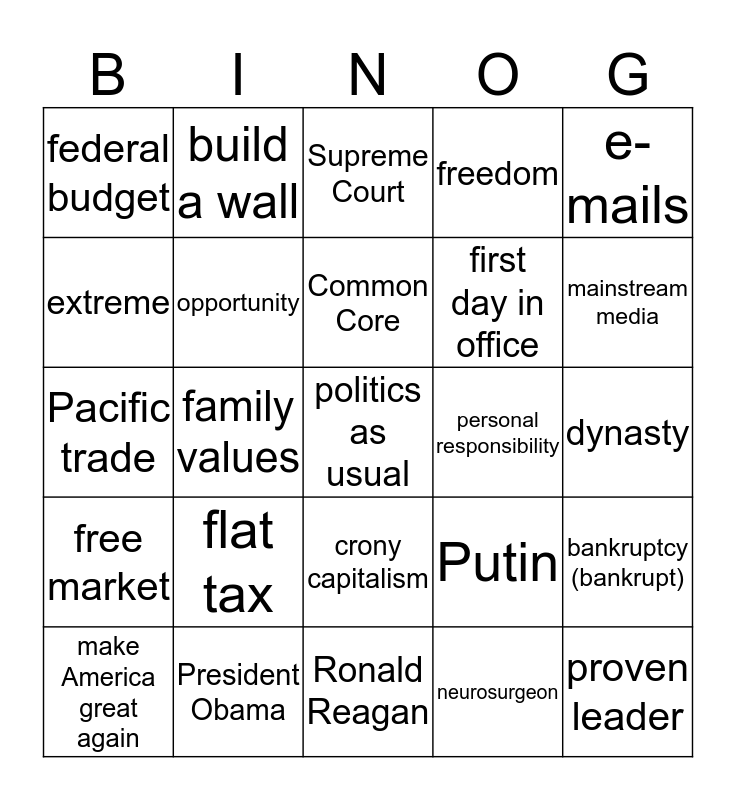 This bingo card has 63 words: 2nd Amendment, American Dream, anger (angry), bankruptcy (bankrupt), Benghazi, big beautiful door, build a wall, class warfare, Common Core, Constitution, crony capitalism, deport, dynasty, e-mails, establishment Republicans, extreme, family values, federal budget, filibuster, first day in office, flat tax, free market, freedom, government shutdown, governor, Hewlett Packard, Hillary Clinton, illegal immigration, IRS, ISIS (ISIL), Keystone Pipeline, left wing, let me finish, liberal agenda, mainstream media, make America great again, middle class, neurosurgeon, nuclear Iran, opportunity, Pacific trade, personal responsibility, political correctness(PC), politicians, politics as usual, President Obama, proven leader, Putin, radical Islam, religious freedom, repeal Obamacare, Ronald Reagan, scandal, Social Security, special interests, Supreme Court, Tea Party, the greatest, traditional marriage, veterans, war on terror, Washington, DC and working families.